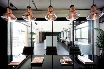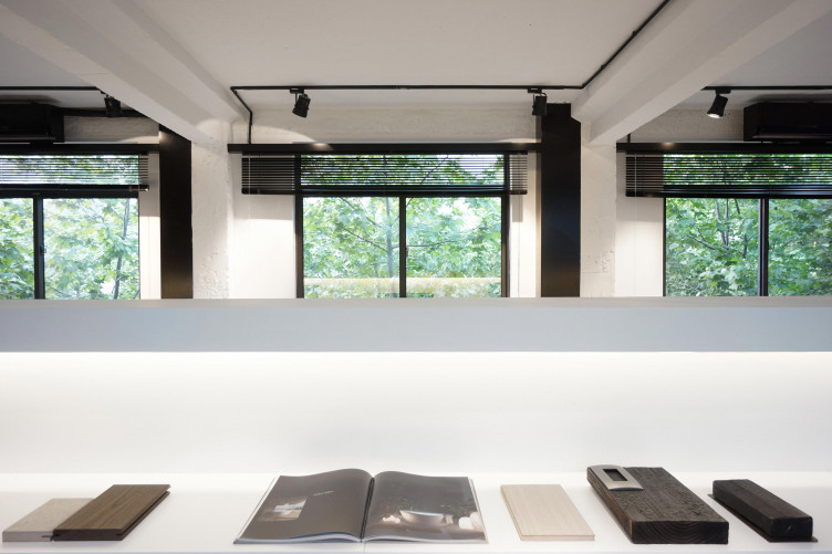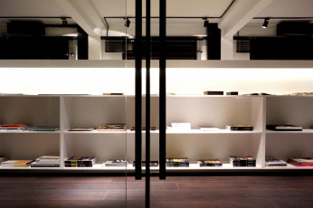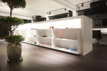 迎接来宾的是一个八米长的书架,展示最新的设计类刊物和一系列材质样本。开放的空间、低矮的隔板和透明的表面便于视线的穿透,从而同时监督创作过程的各个阶段。