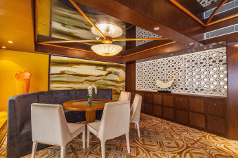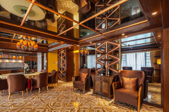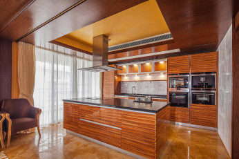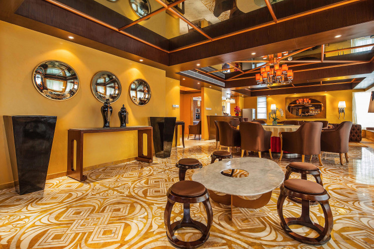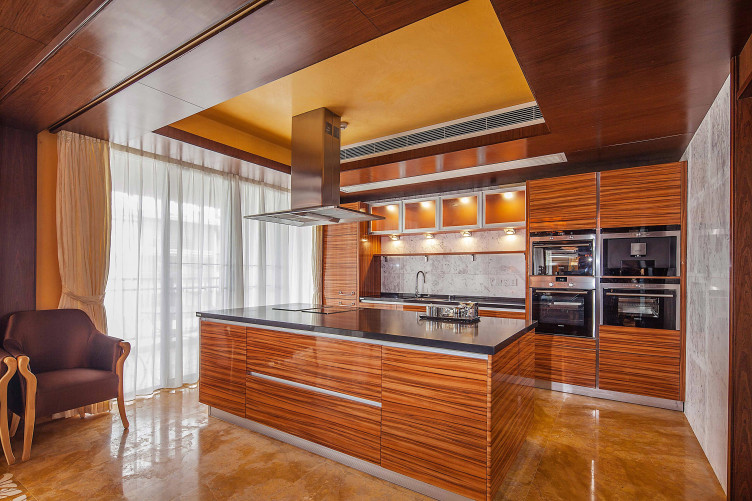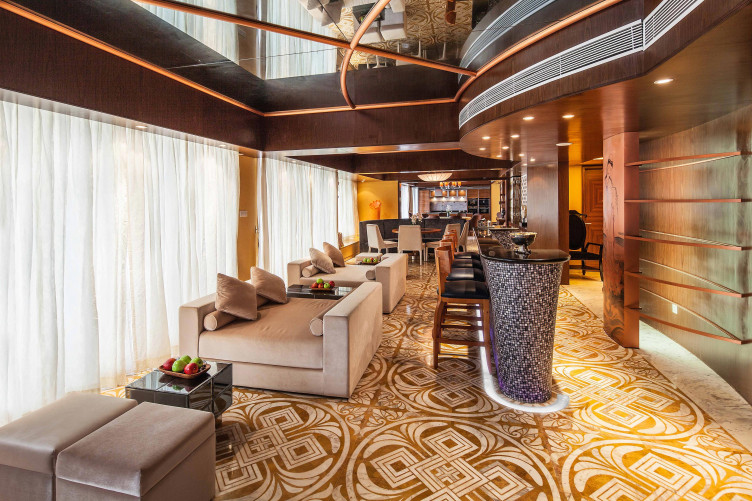 会所综合了宾馆的奢华和居家的舒适。一种光彩绚丽的感觉渗透了整个空间:从能够招待二十个客人的餐厅,到家庭影院,spa,再到办公区域,有精致台球桌的休闲区域,还有私人客房,每一间都有美不胜收的海景。木头和深色镜面带来的阴暗而高贵的质感完整了各个空间,与白色和金黄色的大理石镶嵌地板形成对比。所有的内部装修全部使用意大利原装产品。