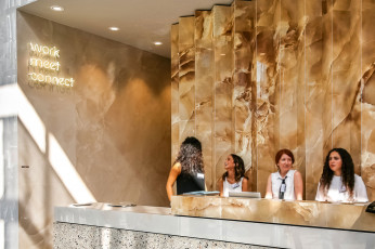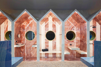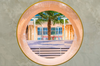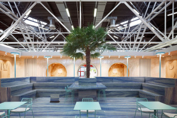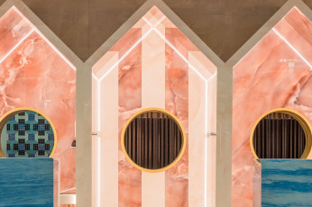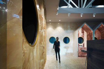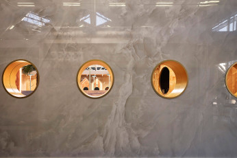 以一个融合了休闲和工作空间的理想环境为背景,“人才池”概念被赋予了一种戏谑的诠释方式。我们在展台内用水纹般的Azul Macaubas 大理石纹样瓷砖搭建了一个假游泳池:一个强烈的视觉焦点。池中提供一些非正式的座位区,池中心则是一个休憩区,有一个水吧提供各种精制水。外围墙体和其它体量上圆形的开窗,保证了池中的景象完美的传达。