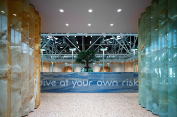 在2108意大利博洛尼亚国际陶瓷卫浴展 Cersaie 上,Area-17 设计的 Iris 瓷砖展位用出人意料的方式使用陶瓷材质诠释了现代空间。今年的设计灵感来自于最近兴起的联合办公风潮。这种全新的互动方式和商业模式呼唤着新的建筑语汇的配合。