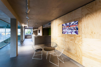 El espacio, aireado y funcional, favorece la idea de transición entre el exterior y el interior. Las grandes ventanas cubiertas por un patrón de gran formato son sin duda un momento de la fusión entre los dos entornos, también el apoyo comunicativo para aumentar la visibilidad de la estructura desde el exterior.