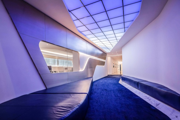 Favoreciendo así el movimiento y la acción a la perfección. El blanco plateado evanescente del mármol y detalles en acero dialogan con el azul intenso del cuero y los tejidos, que refuerzan la idea de los opuestos que se complementan.