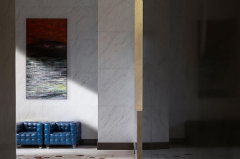 Las reflexiones y el deslumbramiento son otro elemento clave del proyecto. La luz se refleja en superficies de metal y mármol pulido, creando una serie de valiosas referencias luminosas que también son bien visibles desde el exterior. Las ilustraciones de jóvenes talentos chinos completan el escenario. El diseño interior se realizó en colaboración con Sergio Mannino.