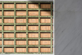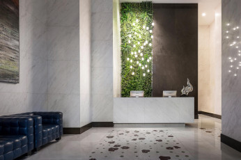 Los interiores expresan una elegancia relajada y fresca hecha de materiales preciosos usados de una manera inusual. Los mármoles policromos dibujan un suelo con incrustaciones que se asemeja a un prado florido, y otras inserciones de mármol verde embellecen las cajas de madera de roble. La cita del mundo natural culmina en los cortes de las paredes verdes verticales, que desde el interior explotan en el camino creando una relación entre los espacios.