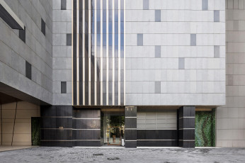 Externamente, el proyecto de configuración se extiende a los tres primeros pisos de la fachada, con un diseño geométrico que juega en la alternancia entre piedra pulida, piedra mate e inserciones metálicas.