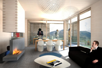 Los volúmenes limpios se apoyan en los desniveles naturales del terreno y enfatizan el movimiento con ligeros cambios de superficies horizontales. Los ambientes internos se abren a 360 grados al espléndido paisaje que lo rodea, abarcando desde el gran valle a los famosos viñedos que se ejecutan en terrazas de piedra de las colinas circundantes.