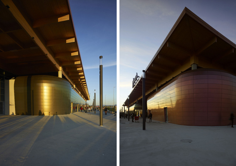 La localizzazione geografica determina lo stile architettonico del progetto di Area-17 con INRES per la realizzazione di un complesso commerciale lungo la via Litoranea Adriatica. Il design si ispira, infatti, al caratteristico profilo movimentato dei tetti a capanna dei dock portuali.