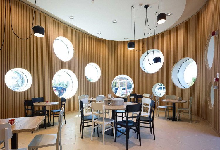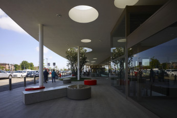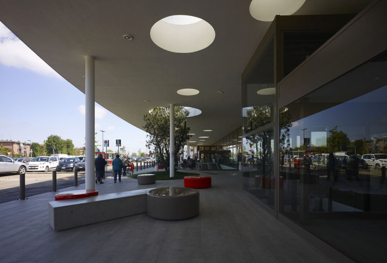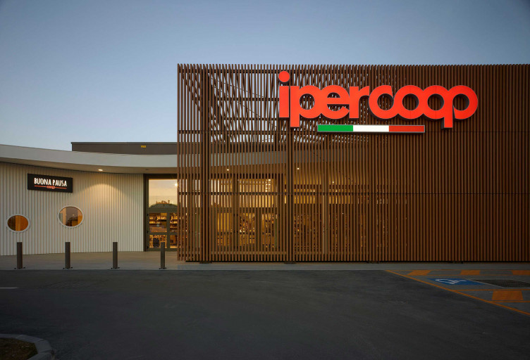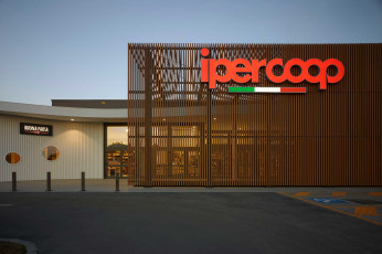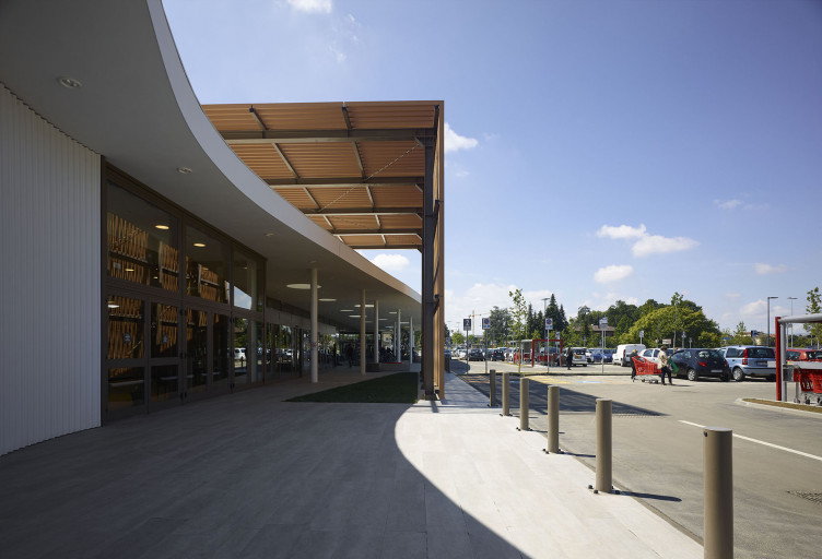 L’esterno dell’ipermercato è un volume netto che curva in corrispondenza dell’area ristoro Buona Pausa, sottolineandone la specificità. Ampie e rotonde finestrature caratterizzano l’ambiente del ristoro e della pensilina che corre lungo tutto il fronte principale. Un frangisole in doghe di legno composito definisce uno spazio di transizione a ridosso dell’ingresso e introduce il tema del riuso legato ai materiali da costruzione, che all’interno trova ulteriore sviluppo nel banco informazioni in cartone pressato riciclato e nell’estensivo uso del legno di larice di provenienza locale.