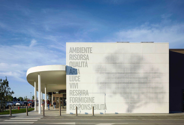 La sensibilità nei confronti delle politiche di riciclo trova la sua massima espressione nel Recycling Wall, un volume bianco giustapposto alla parete est che all’interno racchiude un sofisticato meccanismo di raccolta del rifiuto plastico di qualità. Il muro esterno della macchina, retroilluminato, è simbolicamente traforato per ricreare la sagoma di un albero stilizzato, che crescerà simbolicamente dall’impegno dei cittadini alla raccolta differenziata. La tensione verso la natura e la sostenibilità sono ben rappresentati anche dall’abbondanza di luce naturale che caratterizza gli interni e dalla parete verde che dialoga con gli scorci della campagna circostante, sempre visibile da dentro il punto vendita attraverso le vetrate in facciata.