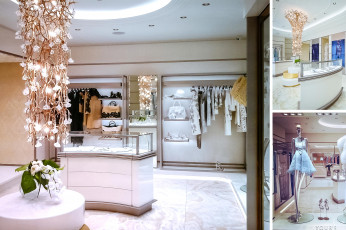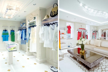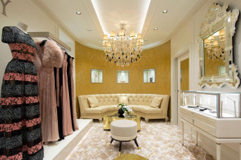 L’ingresso è uno spazio di transizione tra l’interno e la città, su cui si apre con una parete interamente vetrata. Da qui, tre portali invitano alla scoperta degli altri ambienti: la stanza principale che ospita la collezione di Elie Saab e la stanza dedicata a Ermanno Scervino. Completano il progetto la VIP room, il vestibolo, la powder room e il raffinato giardino centrale, dove vengono ospitati cocktail ed eventi privati.