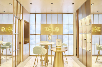 Gli interni luminosissimi giocano con una sofisticata palette di colori neutri e chiari, scandita e ritmata da elementi in oro satinato. In questo spazio chiaro, intimo e avvolgente, quasi una privata powder room, dove anche i lampadari sono trasparenti e sembrano aleggiare nell’aria come nuvole nel cielo, emerge con vigore l’insegna Zèle pur senza uscire dalla dinamica di un raffinato tono su tono.